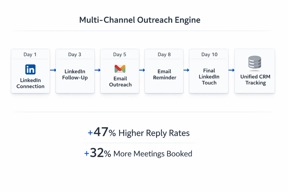 LinkedIn-only outreach limits scale and visibility. Response rates improve significantly when LinkedIn outreach automation connects with email follow-ups.