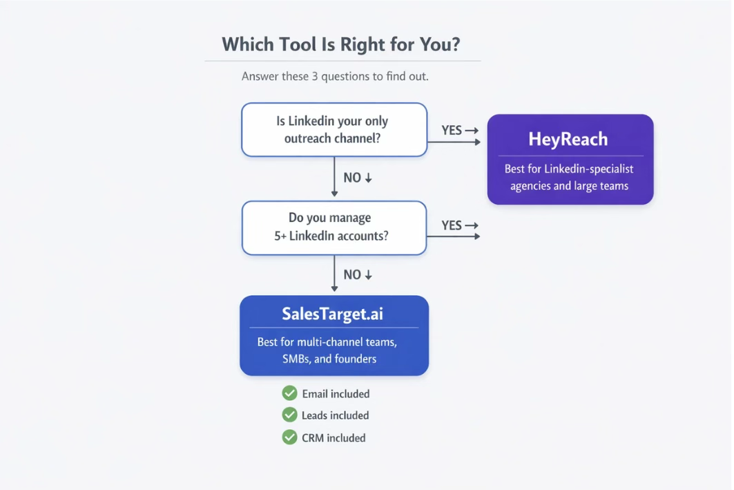 For LinkedIn-only agencies managing 50+ sender accounts, HeyReach's flat-rate Agency plan ($999/mo) is purpose-built and competitive. For everyone else — solo users, small teams, and agencies running blended outreach — SalesTarget.ai's $29/account LinkedIn pricing and all-in-one platform deliver significantly better value and more complete outbound coverage.