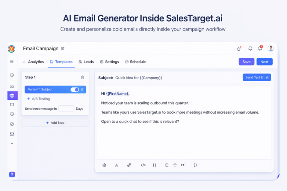SalesTarget.ai integrates AI content generation directly into the cold email outreach workflow. Instead of writing emails in one tool and sending them from another, users can generate email content inside the platform based on their target audience and campaign goal.