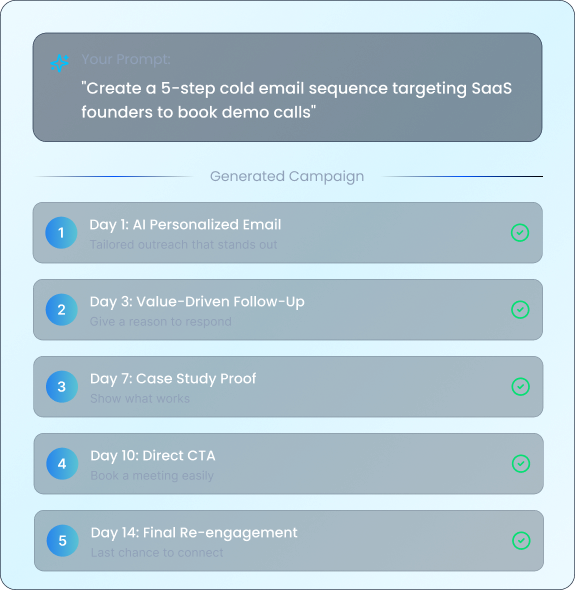 Copilot turns your prompt into a complete cold email campaign — sequences, messaging, timing, and follow-ups ready in minutes.